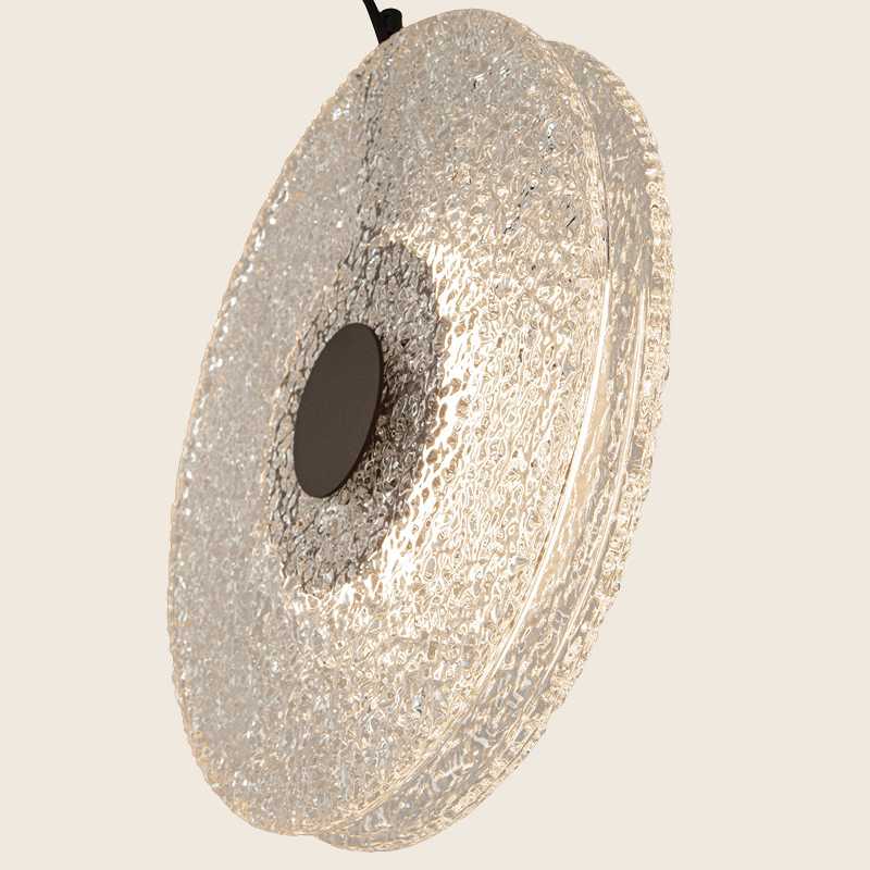 The Aster collection features textured glass discs that create a radiant, celestial glow reminiscent of starbursts and lunar surfaces. Available as wall lights and pendants, Aster delivers a striking sculptural presence with soft, atmospheric illumination for contemporary interiors.