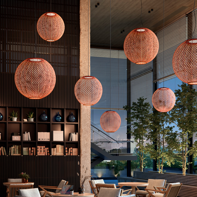 The design intent of the Nans collection was to highlight the craftsmanship of the lampshades and to explore different ways of weaving, by combining different colours and formats to create a true Mediterranean style.