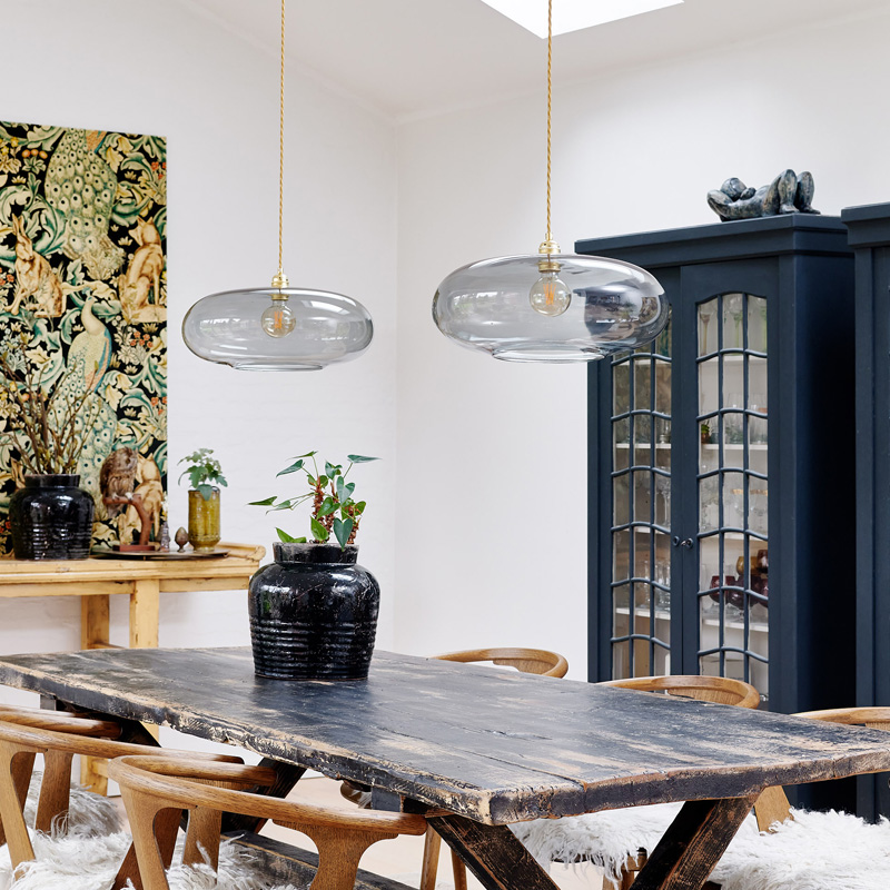 A blend of mouth-blown glass and metal finishes in a variety of colours.