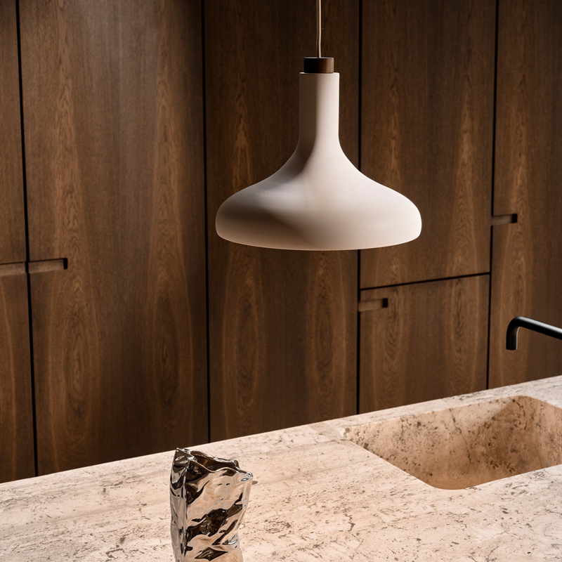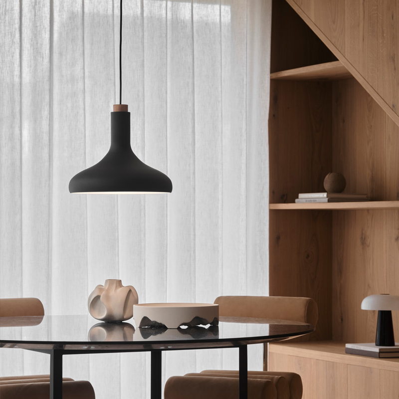 The Fuji Pendant finds perfect balance in the meeting between two classic materials. The soft, organic lines of the FSC® certified wooden top add a natural warmth to the sleek, industrial look of the metal shade. Fuji is ideal above dining tables or kitchen islands, casting pleasant, downward illumination.