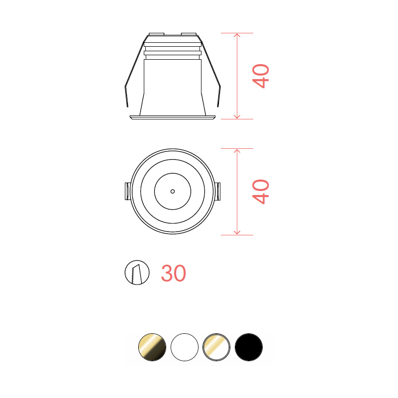 Dimensions: Ø 40mm x D 40mm | Cut-Out Ø 30mm