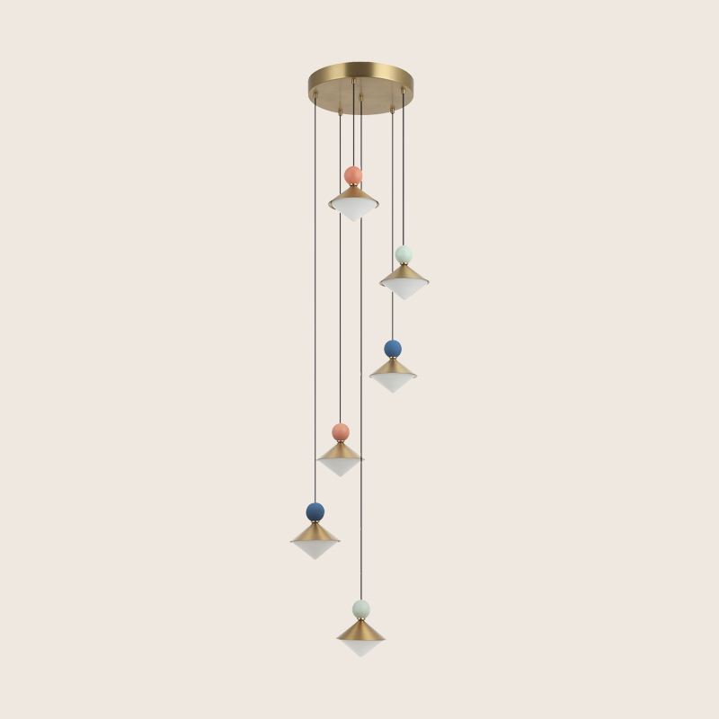 The Lyra Collection pairs sculptural geometry with celestial softness, featuring cone diffusers balanced by coloured spherical accents for a playful yet refined expression of light.