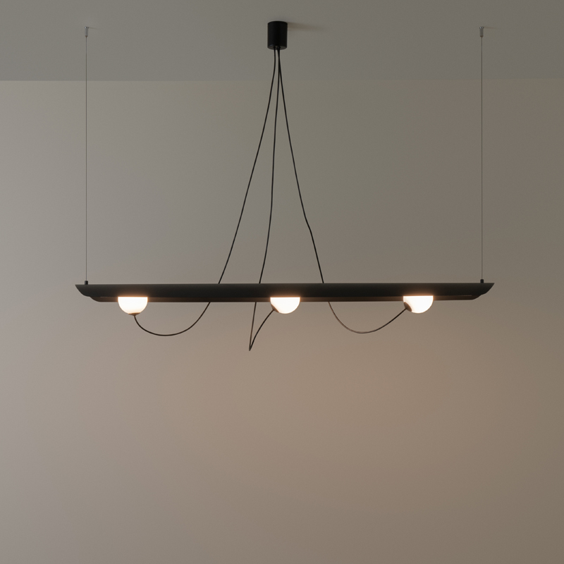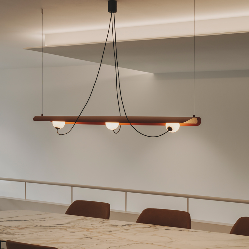 The Milan Wire Collection blends acoustic performance with playful flexibility. A magnetic glass globe can be freely repositioned along the felt-covered panel, allowing you to tailor both light and look.