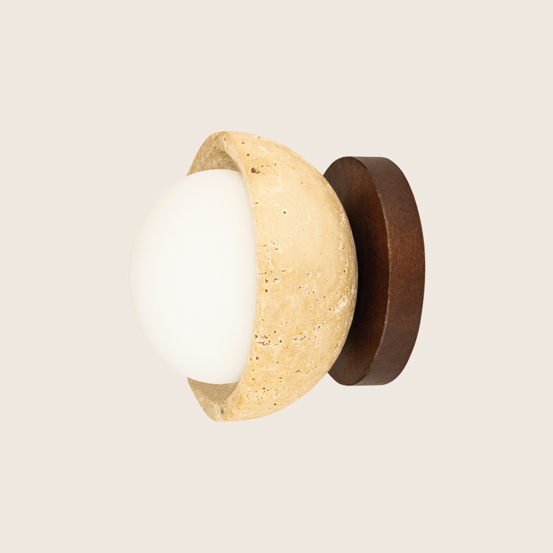 A sculptural travertine dome paired with a smooth glass diffuser and stained wood base, the Petra Orb Wall Light brings warm, organic character to modern interiors. Its carved stone form softens the glow, creating a gentle, atmospheric accent.