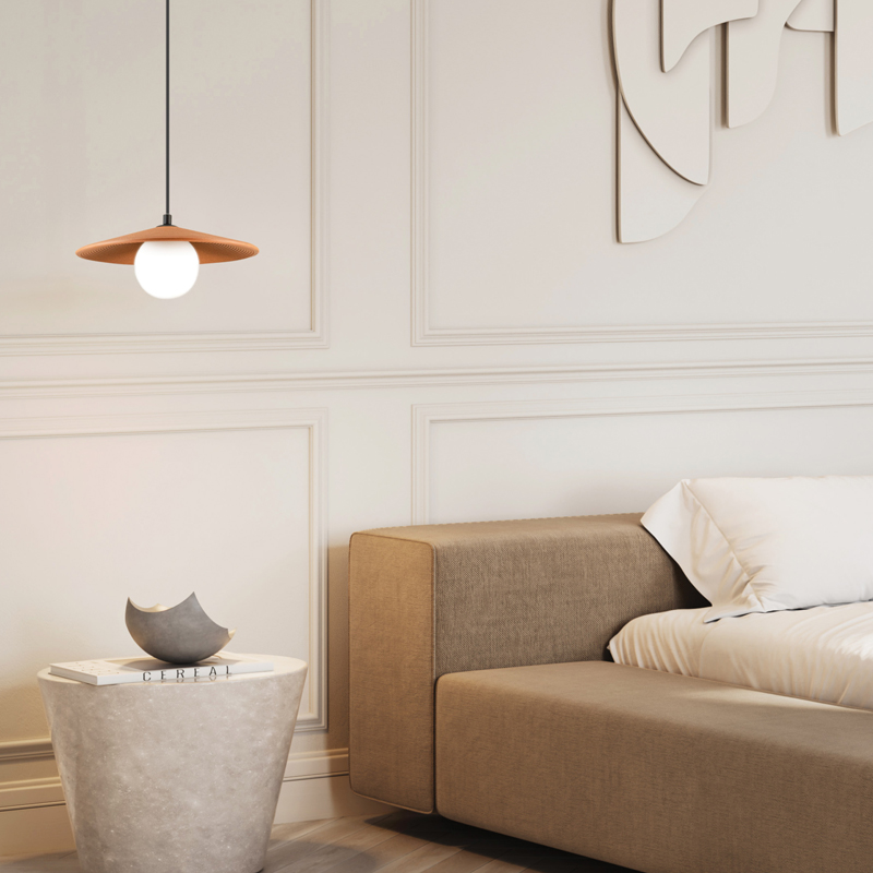 Inspired by the flared shape of the Greek phiale bowl, the Phiale Pendant combines a sculptural ceramic shade with a glowing orb diffuser. Its refined, upward-flaring form creates a warm, atmospheric presence in both residential and architectural spaces.