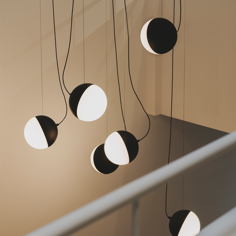 Inspired by lunar phases, the Half collection plays with geometry and contrast through its adjustable, semi-circular diffuser and bold silhouette. Emitting soft, even light, it's ideal as a statement piece in stairwells, entryways or open spaces.