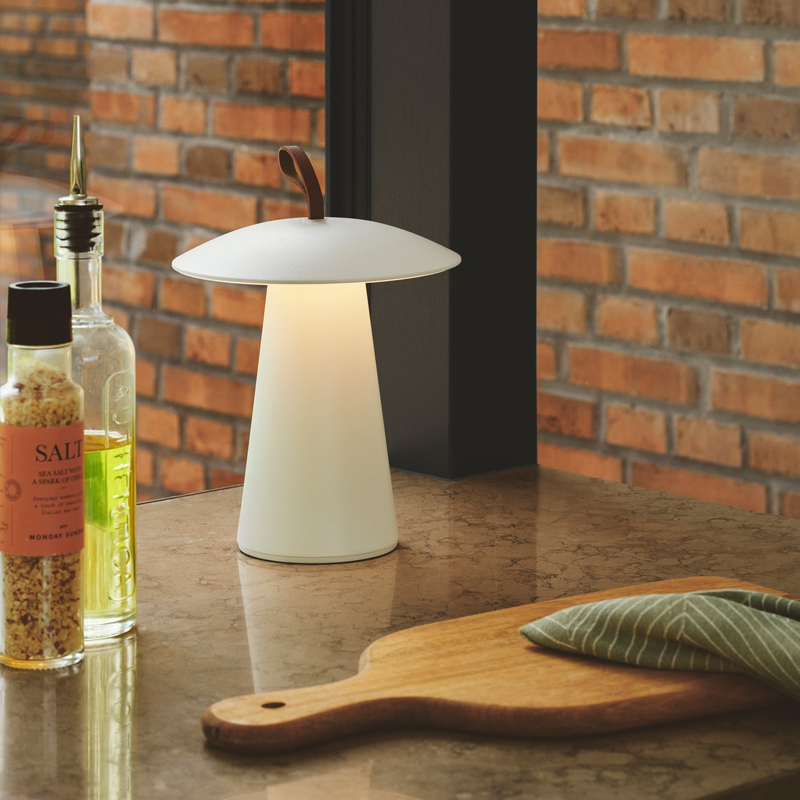 This small, portable table lamp, Ara, is perfect for illuminating evenings on your balcony or terrace. The lamp has a cute, cone shaped design with soft leather details. Easy to bring with you and place wherever you need it. Create the perfect lighting with the built-in dimmer function and up to 80 hours of battery life. The lamp is easily charged with the included USB cable.