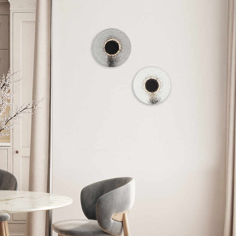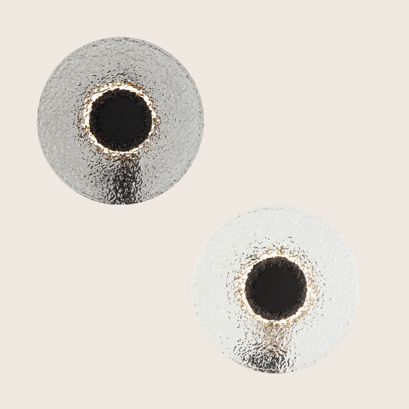 The Aster collection features textured glass discs that create a radiant, celestial glow reminiscent of starbursts and lunar surfaces. Available as wall lights and pendants, Aster delivers a striking sculptural presence with soft, atmospheric illumination for contemporary interiors.