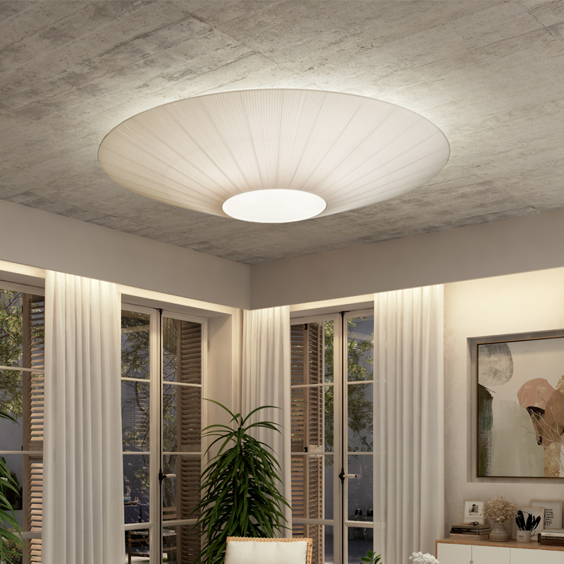 SIAM breaths a certain oriental air derived from the inverted shade. Featuring anti-dust and easy to clean semi-translucent ribbon, this dramatic and over-sized ceiling light provides ample light while serving as a soft, textural focal point.