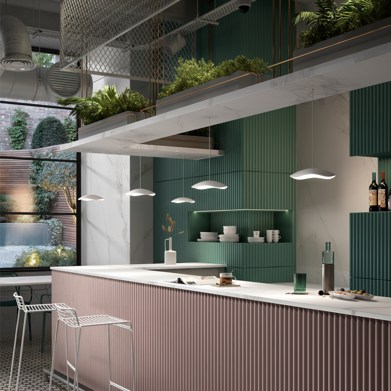 The Valentina S/24 pendant features a soft, sculptural form with a layered interior that creates warm, comfortable downward light. Its organic shape brings a gentle sense of movement, making it ideal for use above service areas, benchtops, or bedsides.