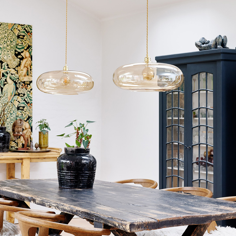 A blend of mouth-blown glass and metal finishes in a variety of colours.