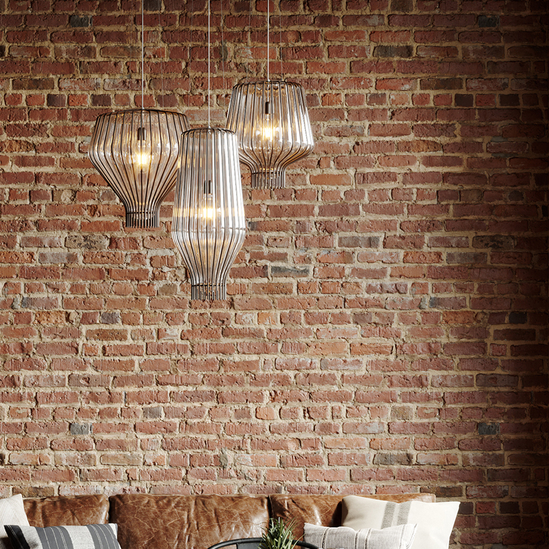 The Saya pendant lamp is made up of a white and transparent glass blown on metal cages available in three finishes: burnished, golden and chrome. There are three shapes available and they are suitable for every room.