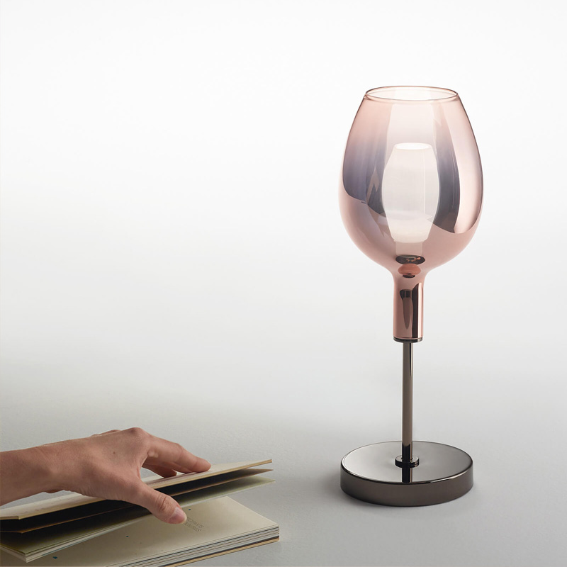 Rosè Cordless designed by Danilo De Rossi is able to create the perfect atmosphere, providing soft, diffused illumination through both a frosted internal glass diffuser and a semi-metalised blown glass shade. Featuring up to 8 hours of battery life rechargeable via USB and available in either a Shiny Rose, Shiny Titanium or Shiny Gold finish with Iron Grey metal structure.