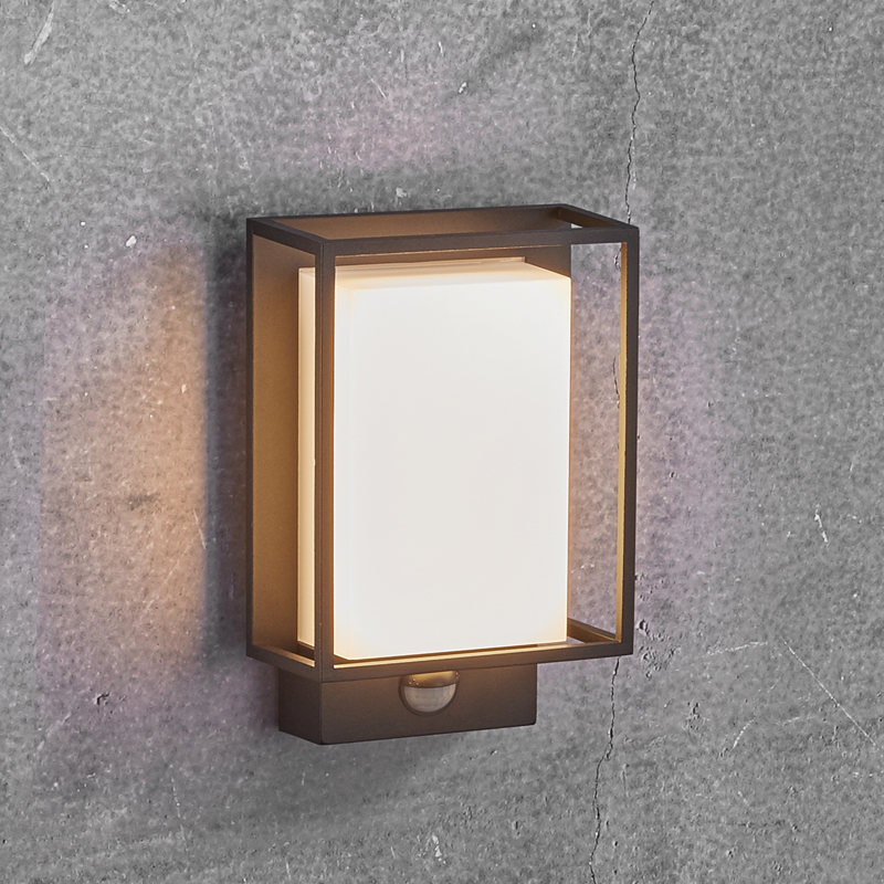 Outdoor wall light featuring a built-in sensor. Sensor has a trigger depth of 10m and 120 degree visibility.
