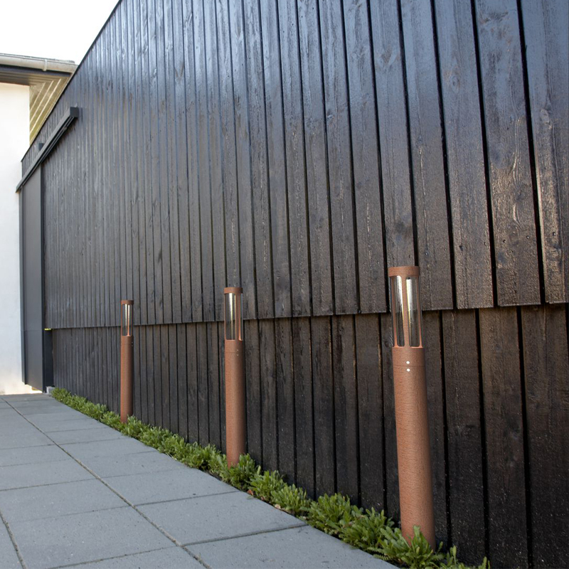 Helix illuminates outdoor areas with its distinctive design. The screws are visible, and the finish exudes raw confidence. The actual light bulb is hidden from the eye. It comes from below and ensures indirect lighting, which is evenly distributed in the top part of the light.