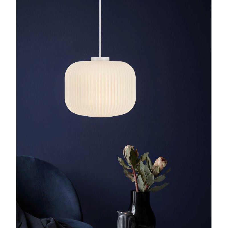 Pendant light made from white ribbed glass. Also available in another shape/size. Rated IP20. Designed in Denmark.